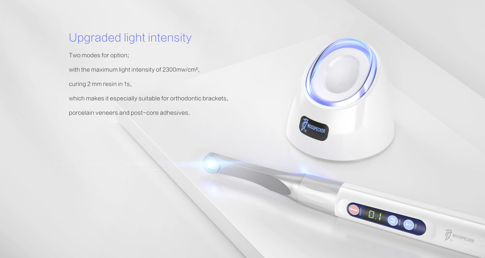Experience unparalleled curing efficiency with the Woodpecker iLED Plus Curing Light, now upgraded with focused light output technology. Using a constant power output, this light has a cure time of 1 second for 2mm of resin, with a light intensity of up to 2300 mW/cm², which makes it especially suitable for orthodontic brackets, porcelain veneers, and post-core adhesives.