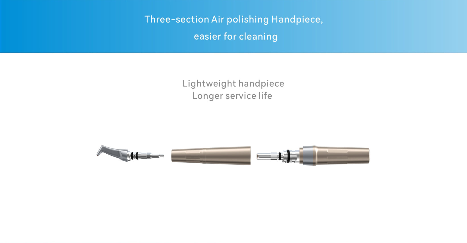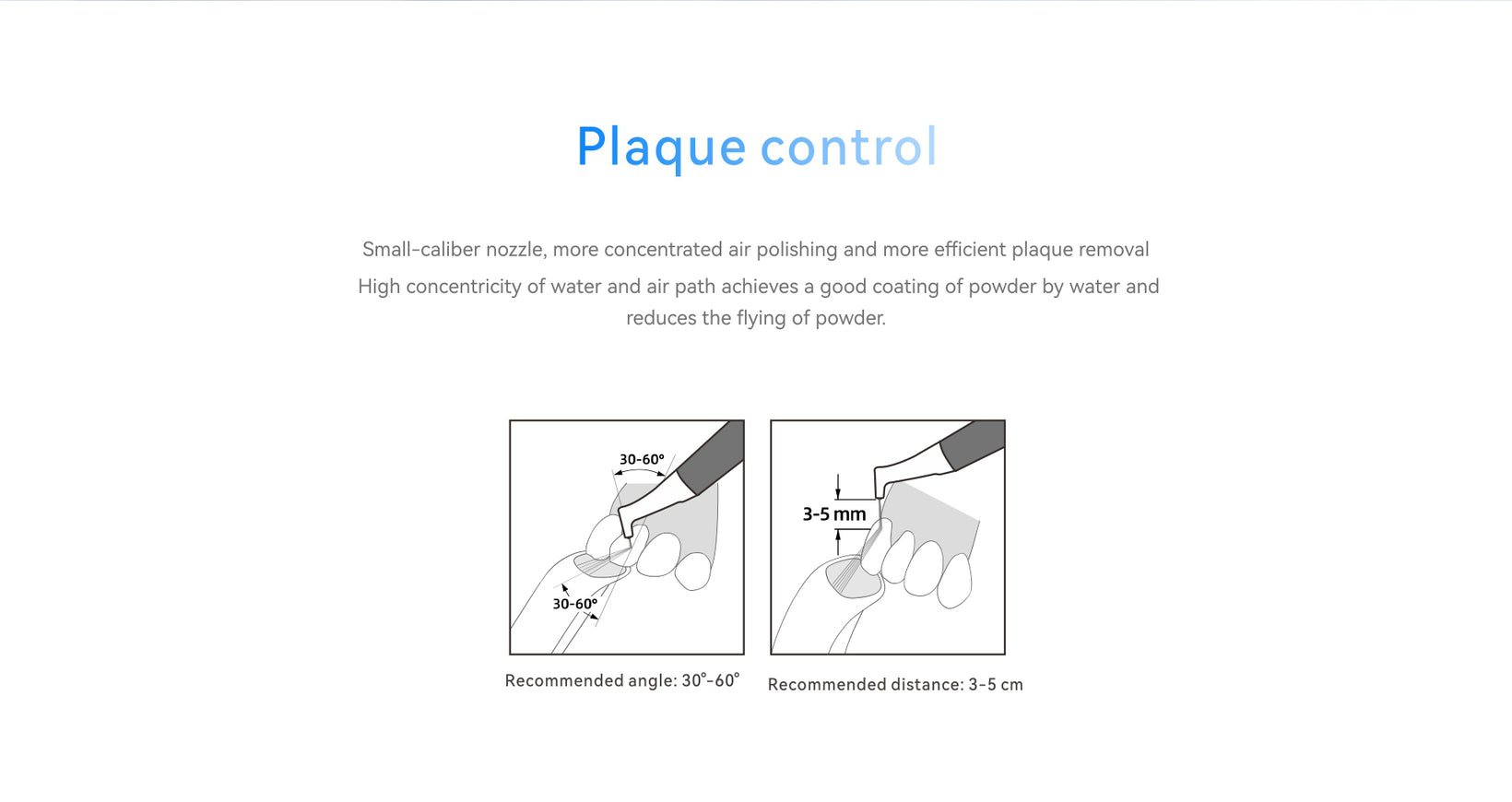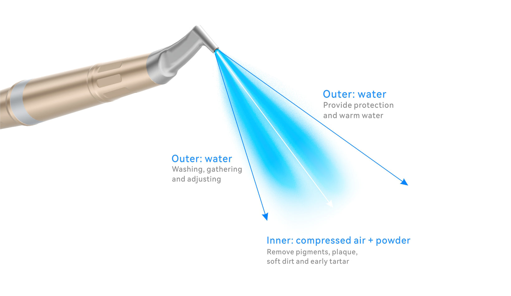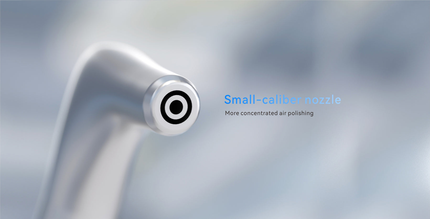 - Precision spray: A precise and easily manoeuvrable nozzle for more concentrated air polishing, making it highly efficient at powder usage and performance
