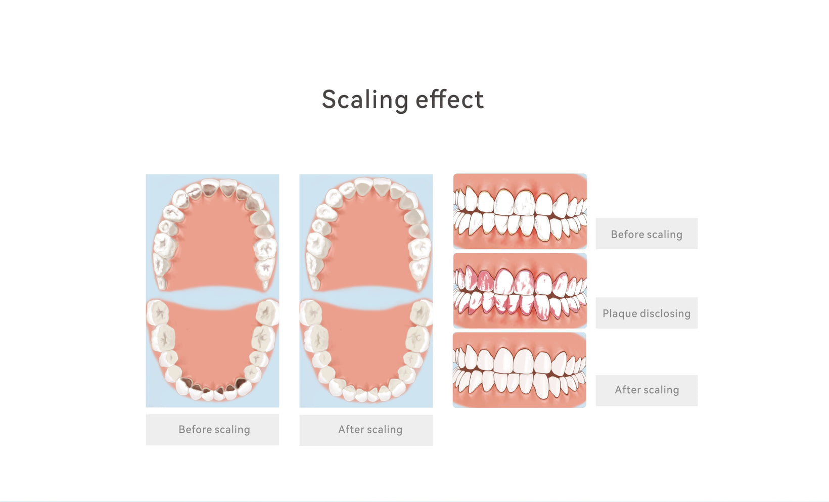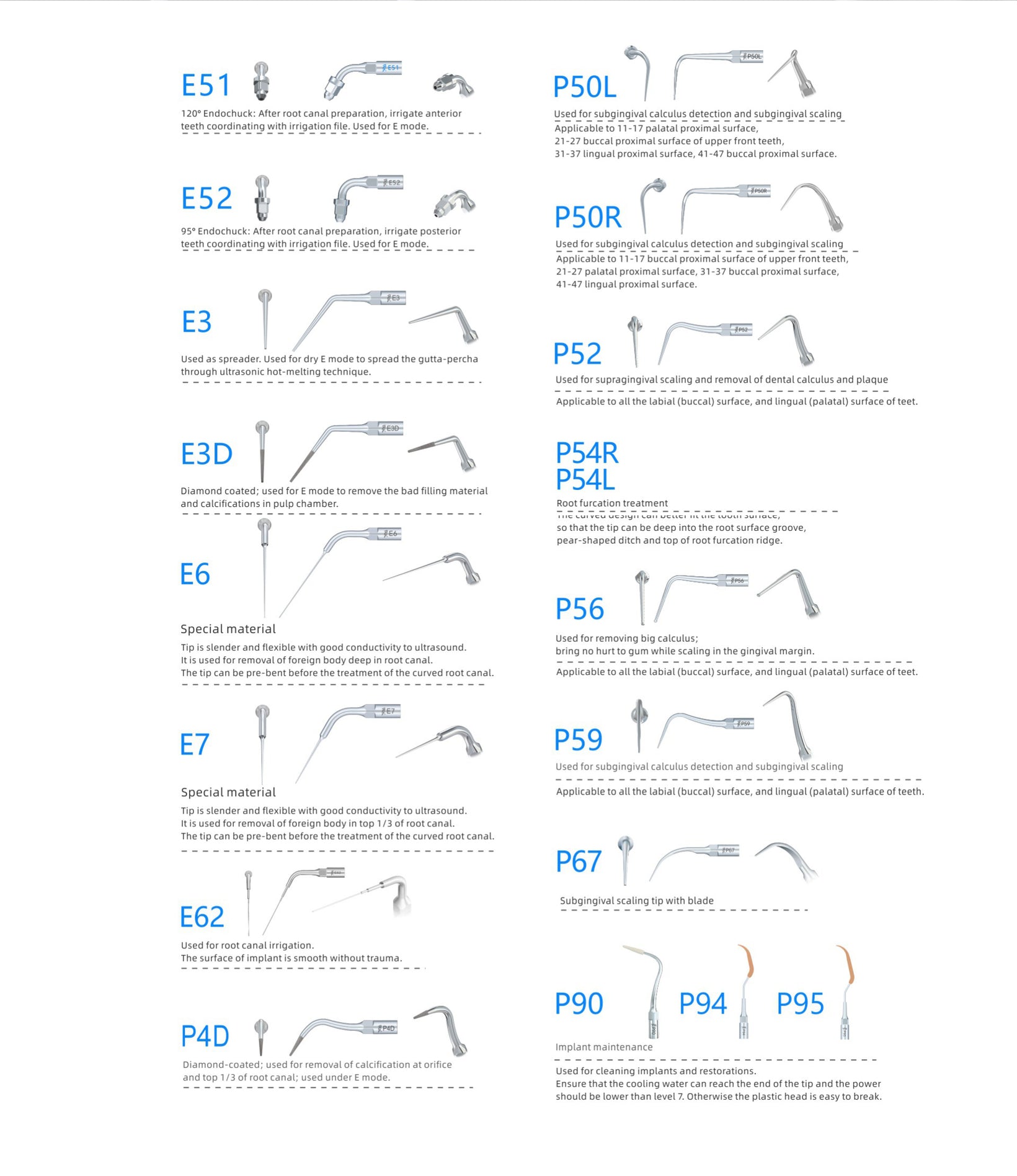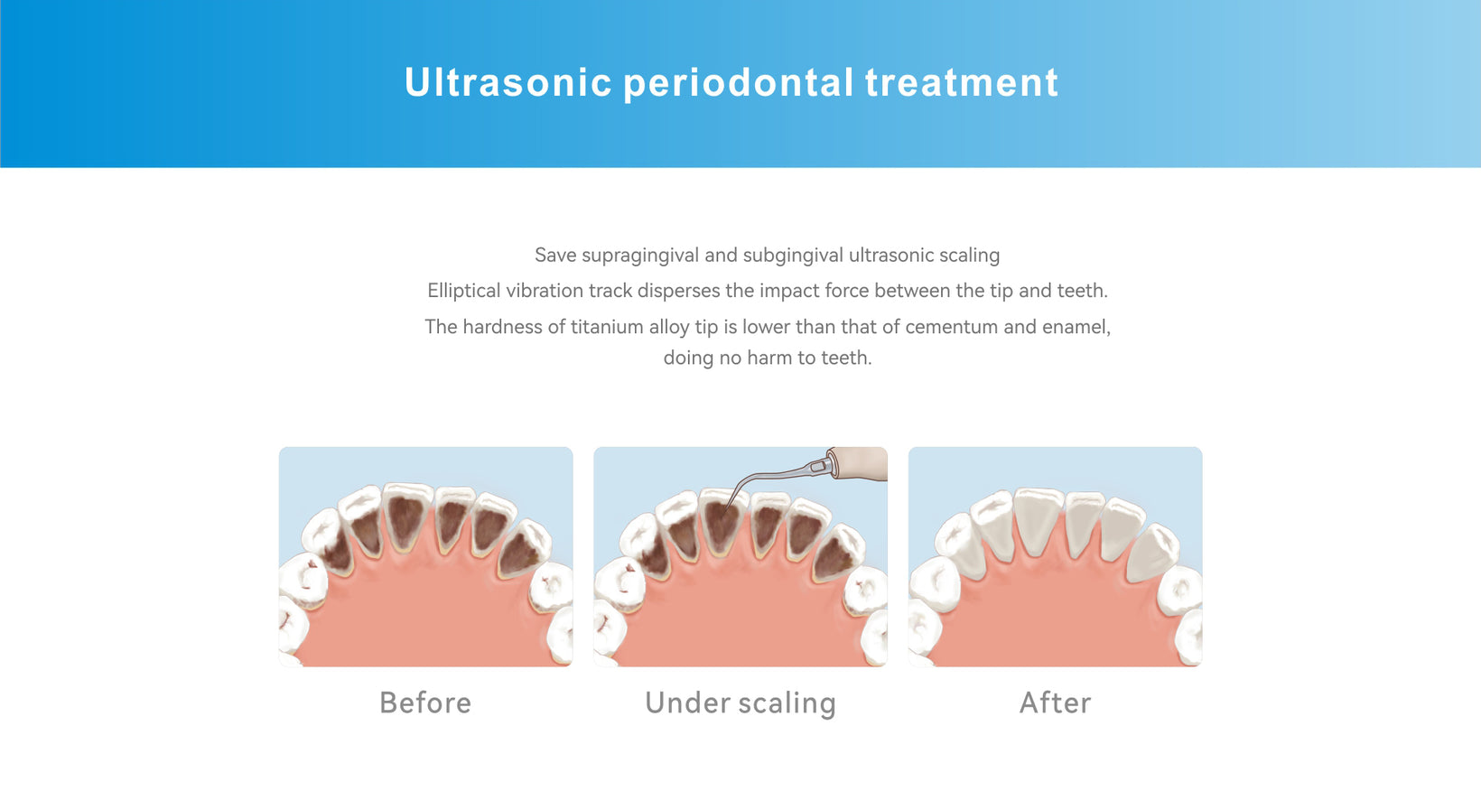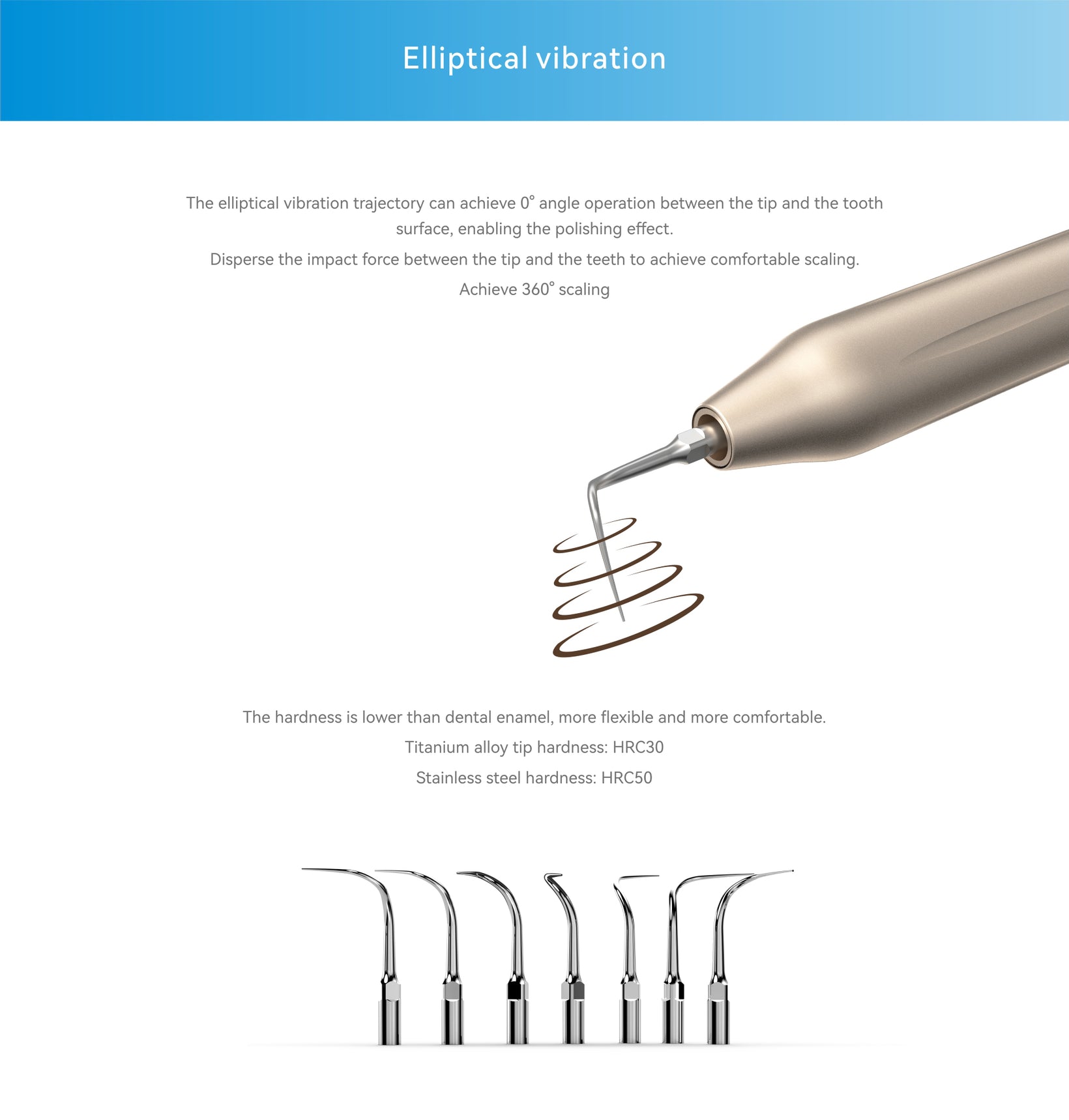- Titanium alloy tips: Minimal invasiveness, maximum patient comfort. Effectual constant power output and more comfortable scaling to remove stains and biofilms