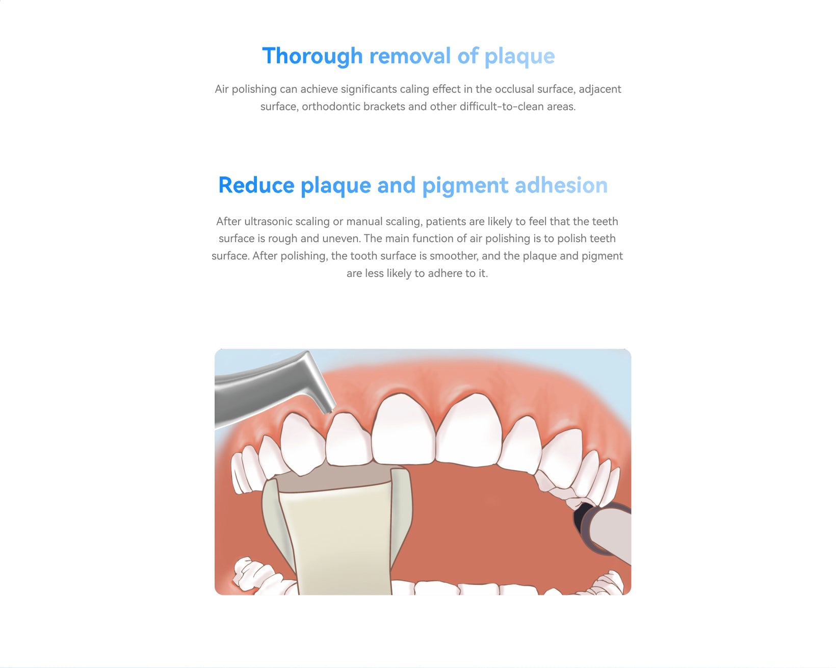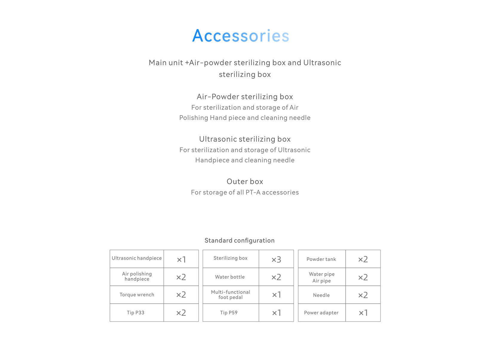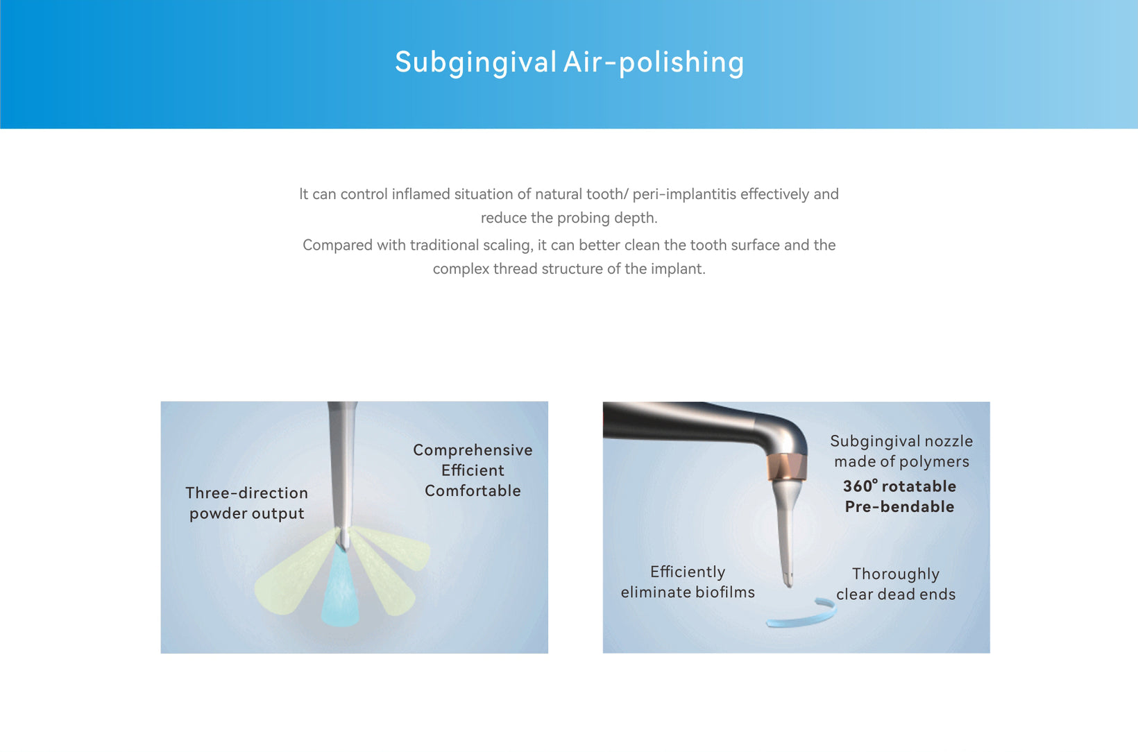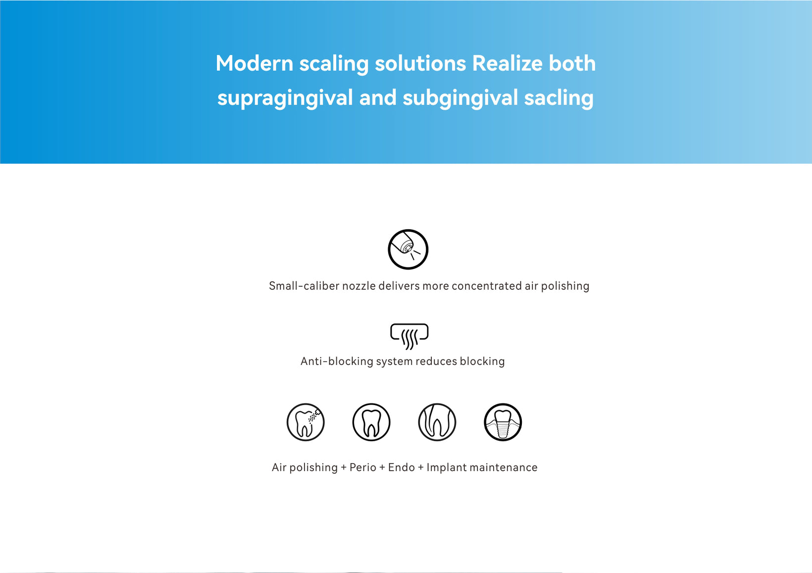 - Single solution: Air polishing ultrasonic periodontal treatment + endodontic treatment + implant maintenance with single equipment