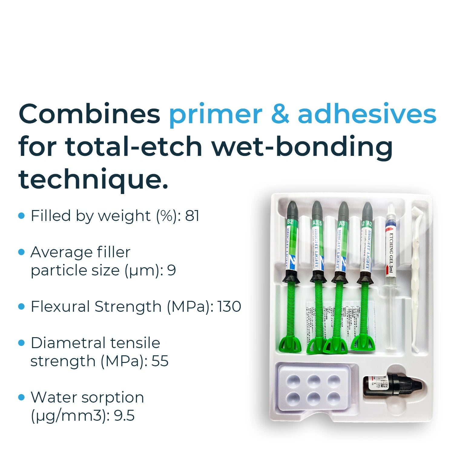 BRIGHT LIGHT is a versatile light curing composite for both anterior and posterior restorations. Its very good consistency guarantees ease in its application and its high gloss polishability increases the resistance to plaque. High filler loading results in excellent physical properties such as high diametral and flexural strength. Due to its very low water sorption, it exhibits long lasting colour stability while maintaining its physical properties over a long period of time.