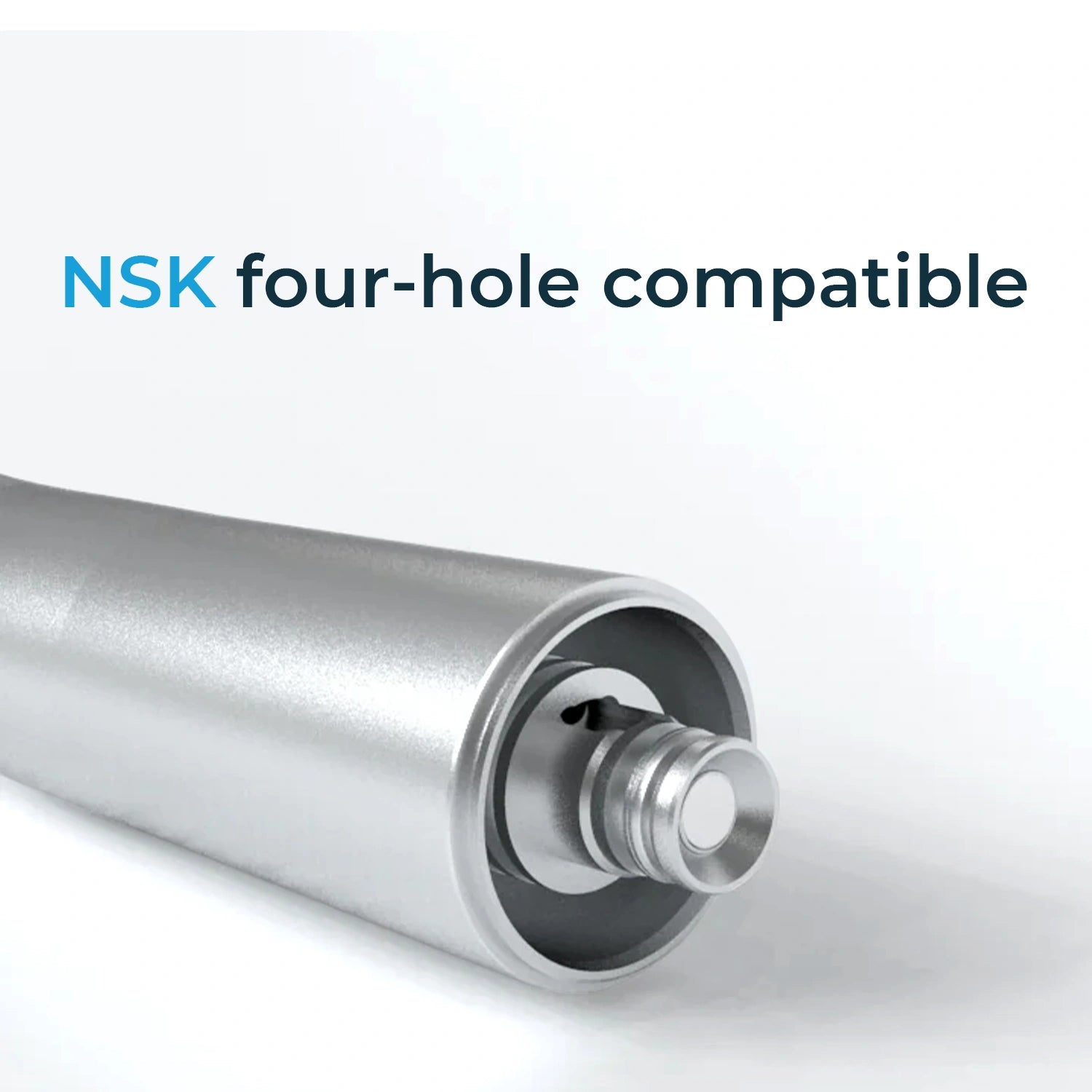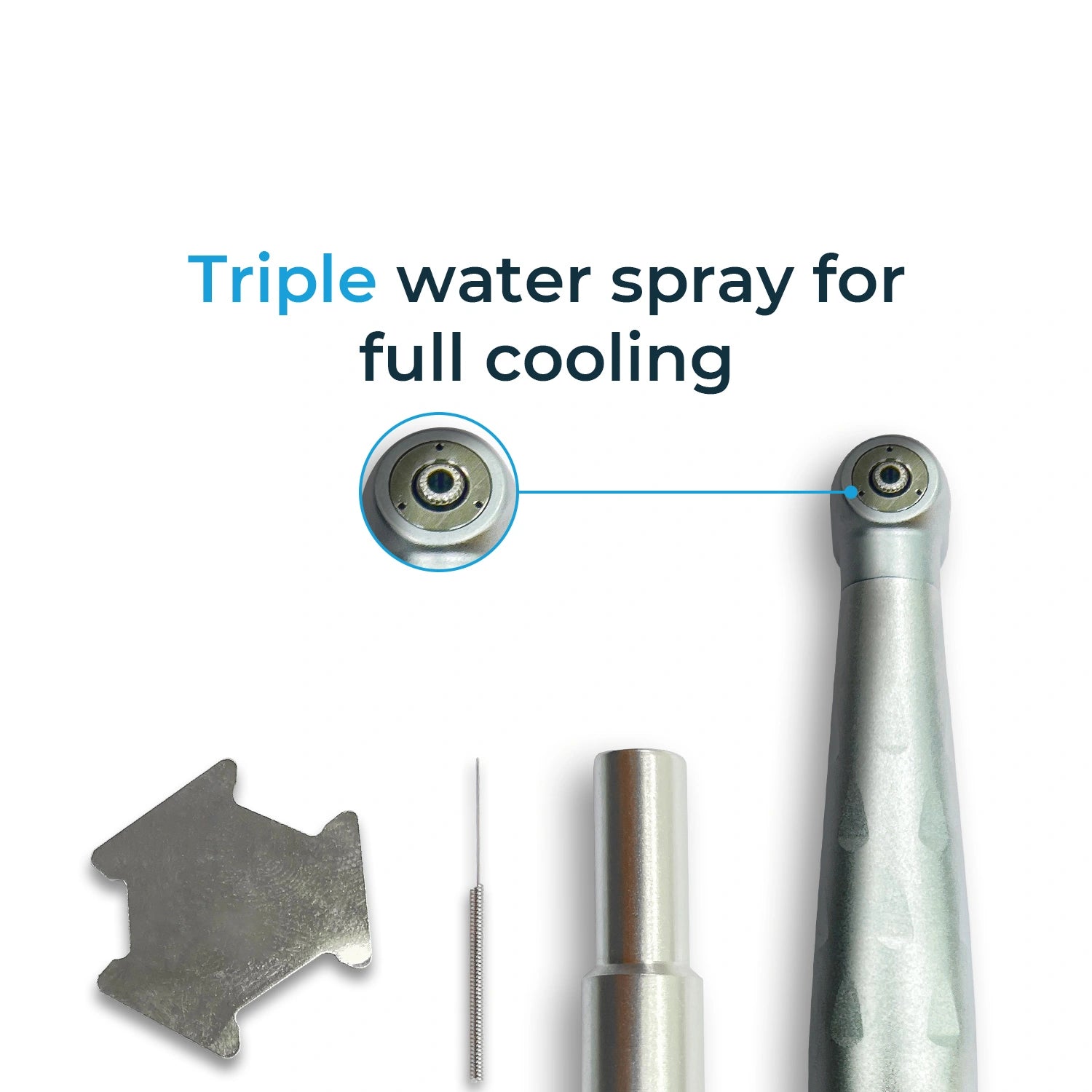 Delma High Speed NSK Compatible Triple Water Handpiece is designed for optimal performance and convenience. Featuring a torque push button and triple water spray, it ensures effective cooling during procedures. Compatible with NSK four-hole setups, it delivers a 25-watt power output for efficient operation. Coupling sold separately.