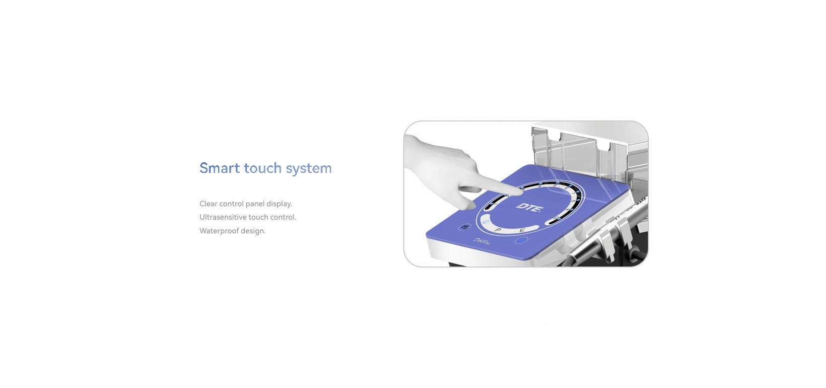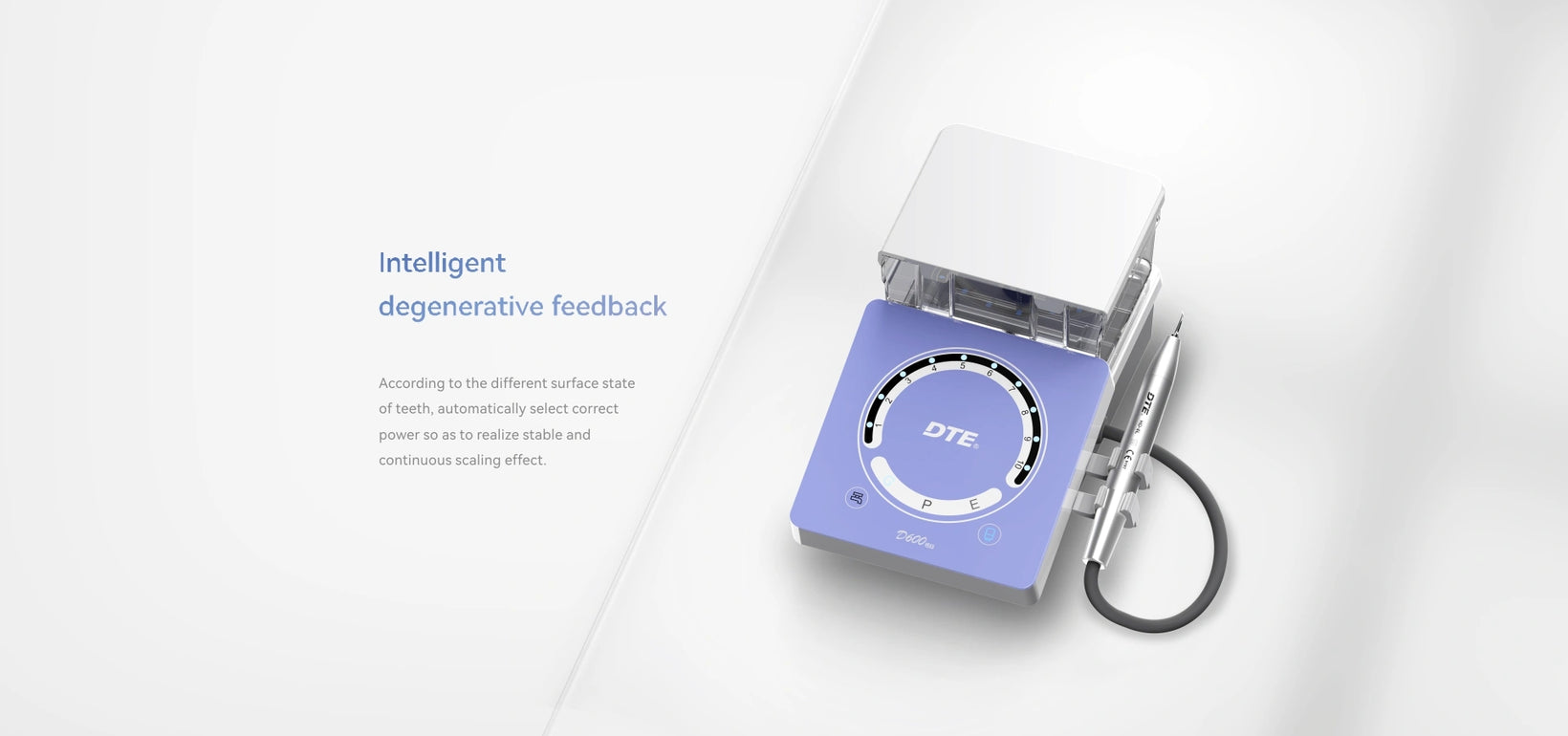 The DTE D600 LED Ultrasonic Scaler provides intelligent power output to enable painless treatment. Depending on the tooth surface, the intelligent feedback automatically adjusts the power output to the tip. The DTE D600 LED features an intuitive touchscreen system with an ultra-sensitive waterproof design.